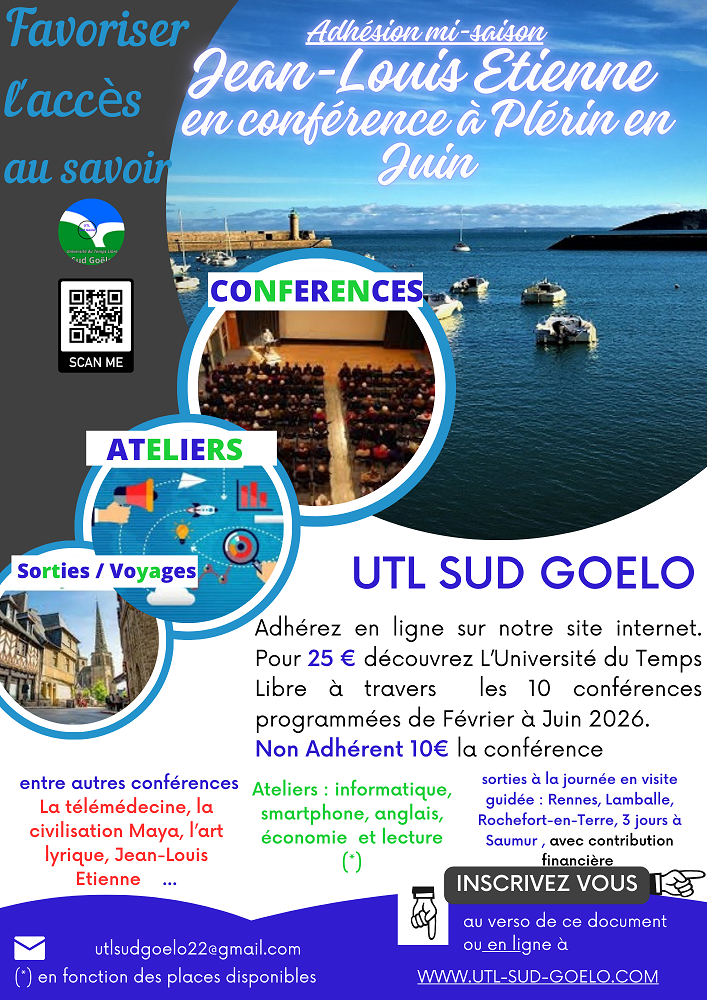 Vous voulez retrouver des livres de classe trop tôt abandonnés, en ouvrir d'autres, vous tenir informé des découvertes de la science, vous initier ou vous perfectionner aux nouvelles technologies ou parfaire votre niveau d'anglais, ce sont les possibilités que vous offre l'Université du Temps Libre Sud Goëlo dans une ambiance conviviale.