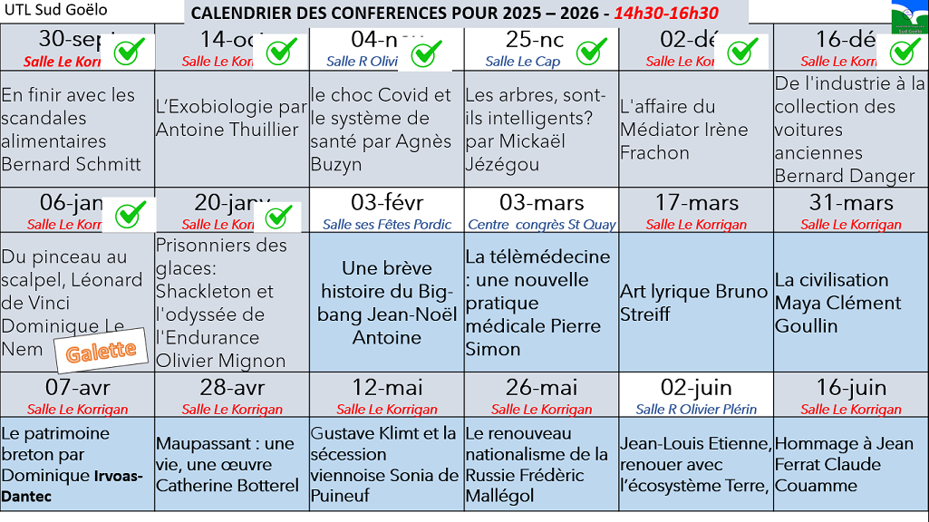 Sous réserve de modifications dans les prochaines semaines, nous vous annonçons ci-dessous le programme des conférences pour la prochaine saison. Horaires : 14h30 -> 16h30.