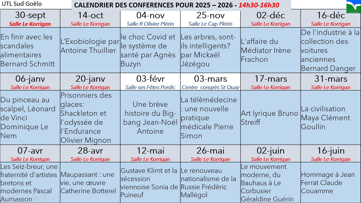Sous réserve de modifications dans les prochaines semaines, nous vous annonçons ci-dessous le programme des conférences pour la prochaine saison. Horaires : 14h30 -> 16h30.