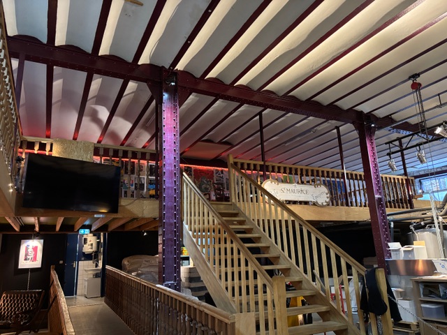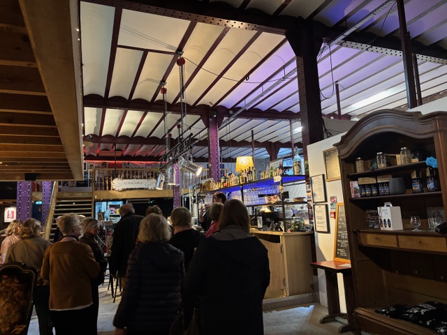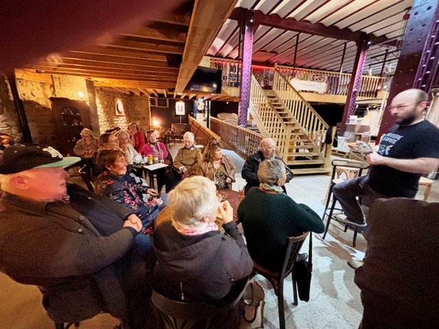 Une surprise nous était proposée pour terminer cette belle après-midi, nous : nous avons découvert un lieu très original, en lien avec le P’tit Echo : une brasserie artisanale du bourg « La Riposte ». Installé récemment au centre du bourg, ce bâtiment servait de lieu stockage du papier de soie et de lieu d’expédition des patrons et de l’imprimerie. Il a ainsi conservé l’architecture métallique (il est resté intact !) et s’est transformé en un magnifique lieu de dégustation de bières fabriquées sur place grâce au talent de Monsieur … celui-ci s’est fait un grand plaisir de nous livrer tous ses secrets de fabrication en précisant bien qu’il ne pourrait être copié ailleurs puis que l’eau utilisée est celle de Chatelaudren !!! Et pendant cet exposé nous avons « goûté » ses excellentes bières (avec modération !).(Ah zut… il ne fallait pas le dire ?!).